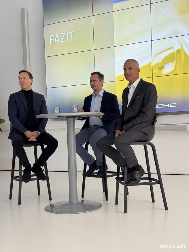 피터 바르가 포르쉐 스타일 외장 디자인 디렉터(왼쪽)과 알브레히트 라이몰트 포르쉐 생산 및 물류 부문 최고책임자(오른쪽)이 23일(현지시간) 독일 라이프치히 포르쉐 디자인센터에서 취재진 질문에 답을 하고 있다.