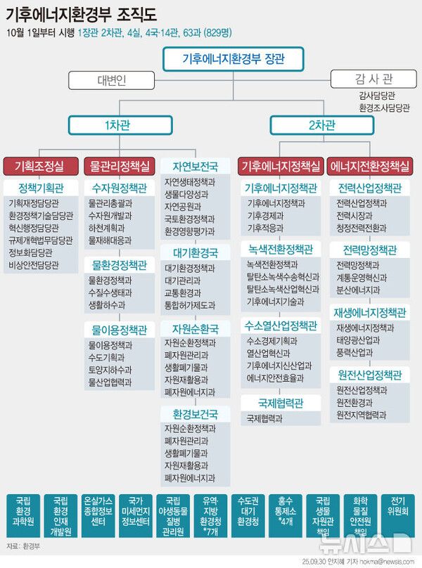 신설되는 기후에너지환경부는 2차관, 4실, 4국·14관, 63과 체제로 꾸려진다. 본부 인원은 총 829명이다.