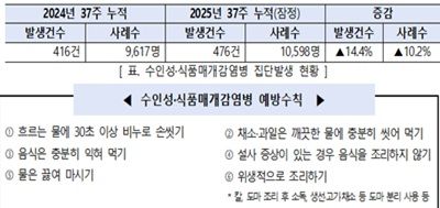 질병관리청의 감시 결과에 따르면, 올해 37주(~9월 13일) 누적 수인성·식품매개감염병 집단발생 건수는 476건으로 전년 같은 기간(416건) 대비 14.4% 증가했다.