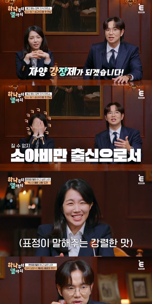 지난 29일 공개된 티캐스트 E채널 ‘하나부터 열까지’에서는 14년 지기 ‘동기 잡는 동기’ 장성규, 강지영이 ‘편의점 털이하고 싶은 나라’ 랭킹 10위까지를 주관적 시선에서 매겼다. 강지영은 “제가 조금 우려되는데 성규 씨와 제가 취향이 조금 다르다”며 걱정을 드러냈다. 장성규는 “제가 소아비만 출신으로서 먹는 것에는 일가견이 있으니까 저만 믿고 차트 따라가시면 된다”고 자신했다. 그러자 강지영은 “무슨 소리냐, 그냥 따라갈 수는 없다. 이건 제 주관적 취향이 들어가는 것”이라며 고개를 저어 신경전을 예고했다.
