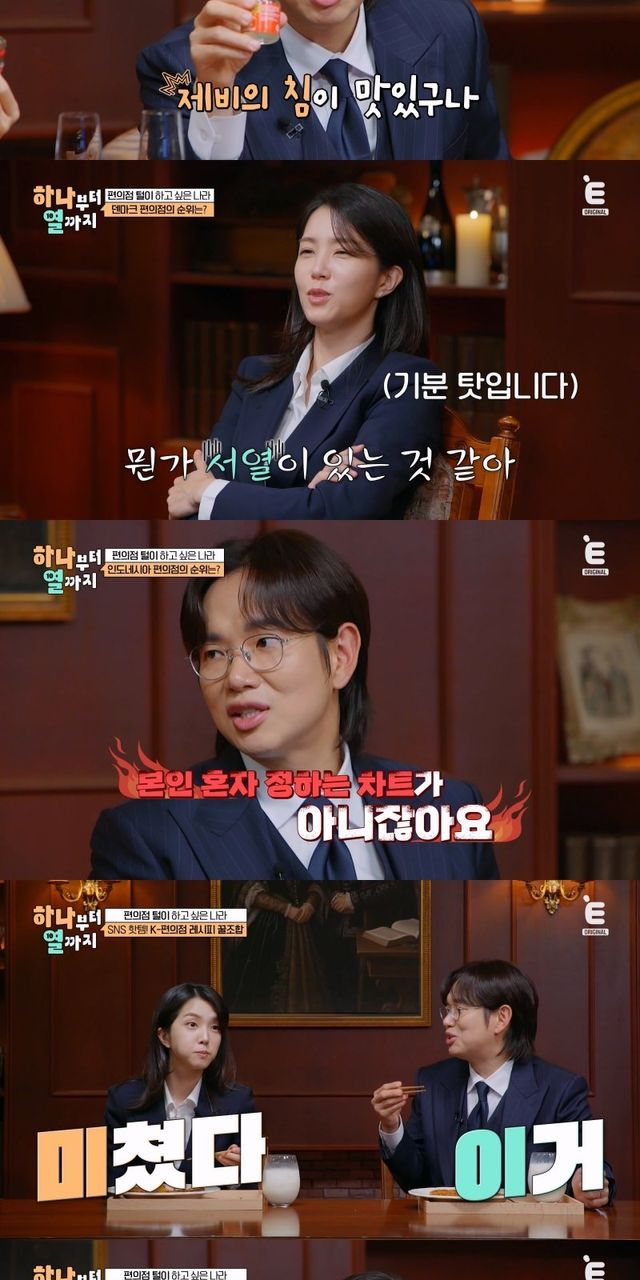 또, 인기 캐릭터의 포토 존을 꾸려 아기자기한 매력을 가진 대만의 편의점은 전통 계란 간식인 차예단과 세계적 위스키 브랜드가 만든 생맥주로 시선을 사로잡았다. 저속 노화가 일상인 덴마크 편의점은 샐러드 가게를 방불케 할 정도로 건강식이 채워져 있었다. 랭킹 보드에서 순위를 손수 바꾸던 장성규는 “다음 회차에 자리 바꾸자. 지영이 부하가 된 것 같다”며 입을 삐죽여 웃음을 자아냈다.