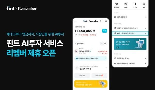 한편, 핀트는 서비스 안내를 위해 이날(30일)과 내달 16일 AI 투자 웨비나를 개최한다. 이번 웨비나에서는 자산관리의 중요성과 핀트의 AI 투자 전략, 서비스 활용법 등을 소개할 계획이다. 리멤버 회원이라면 누구나 무료로 참가 가능하다. 핀트는 추후 연금 투자 관련 상담 서비스도 운영할 예정이다.