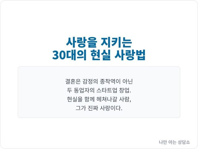“결혼은 현실”이라는 말은 사랑을 포기하라는 경고가 아니다. 오히려 당신의 사랑을 현실의 풍파 속에서 지켜내기 위해, 더 단단하고 성숙한 사랑을 하라는 격려다.