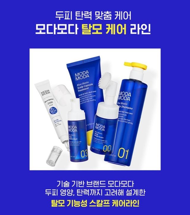 모다모다가 다이소 전용 상품으로 선보인 '블루비오틴 스칼프 라인'이 소비자들에게 주목받고 있다. '블루비오틴 스칼프 라인'은 9월 4일부터 다이소 판매에 돌입했다. 모다모다는 해당 제품들을 다이소 매장에서 제품 당 최대 5000원에 불과한 가격(5000원 이하 가격)에 선보여 탈모케어 진입 장벽을 획기적으로 낮췄다는 평가를 받고 있다.