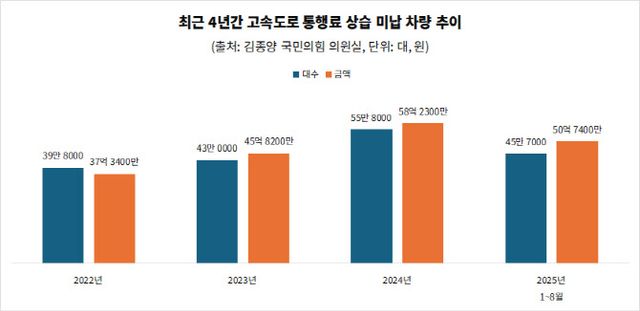 30일 국회 국토교통위원회 소속 김종양 국민의힘 의원실에 따르면 올해 1~8월 고속도로 통행료 상습 미납차량은 45만 7000대, 미납 금액은 50억 7400만원으로 집계됐다. 지난해 전체의 각각 82%, 87%에 해당하는 규모로, 불과 8개월 만에 연간 수준에 근접한 셈이다.