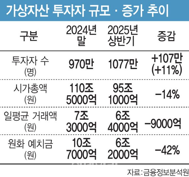 업계 현황은 양면적이다. 금융정보분석원(FIU)의 ‘2025년 상반기 가상자산 사업자 실태조사’에 따르면 6월 말 기준 국내 투자자는 1077만명으로 반년 새 11% 늘며 사상 처음 1000만명을 넘어섰다. 그러나 시장 규모는 오히려 축소됐다. 시가총액은 95조 1000억원으로 작년 말보다 14% 감소했고 하루평균 거래금액도 6조 4000억원으로 줄었다. 원화 예치금은 6조 2000억원으로 42% 급감하며 투자심리 위축을 보여줬다.