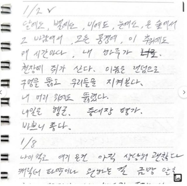 이어 "2018년 1월 2일 자대 배치 직후부터 시작된 일기는 같은 해 봄부터 연인과 일상을 공유하고 마음을 전하는 편지가 됐으며, 그 뒤로 전역 직전인 2019년 봄까지 약 150여 개의 일기 형식 편지로 남았다"고 전하며 김수현의 군 시절 일기의 첫 페이지를 공개했다.