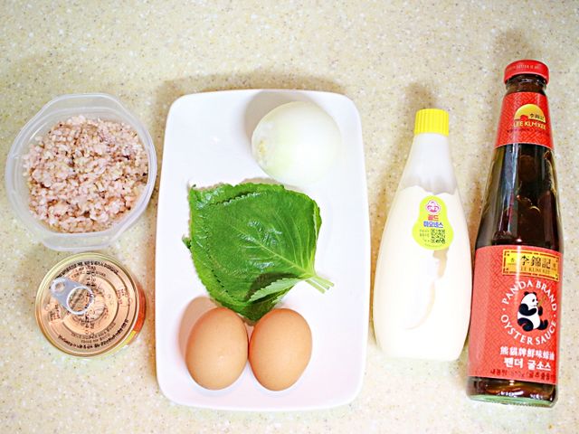 참치캔, 찬밥 한공기, 계란, 양파, 깻잎 준비했고요.