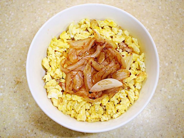 짭조름하게 볶아낸 양파를 가운데 올리고