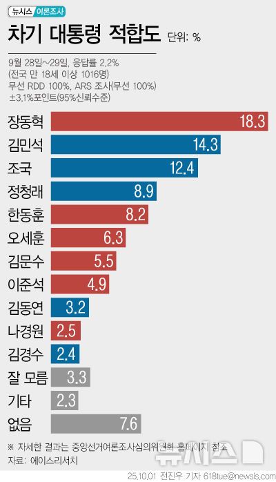 차기 대선주자 적합도 조사에서 장동혁 국민의힘 대표가 18.3%, 김민석 국무총리가 14.3%라는 조사결과가 1일 나왔다.