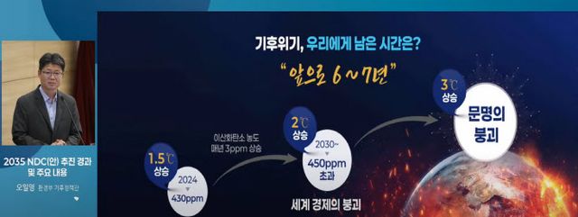 오일영 기후에너지환경부 기후에너지정책관은 30일 오후 서울 여의도 국회의원회관에서 열린 ‘2035 NDC(안) 국회 공청회’(주최 국회기후변화포럼, 대표의원 더불어민주당 한정애·국민의힘 정희용, 연구책임의원 민주당 김성회) 주제발표에서 “탈탄소를 달성하려면 앞으로 10년이 중요하다”며 “지금 바뀌어야 앞으로 바뀔 수 있다”면서 강력한 온실가스 감축 필요성을 제기했다. 국회 차원에서 NDC 관련 공청회가 열리는 것은 이번이 처음이다.