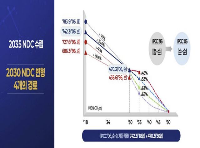 앞서 지난달 8일 환경부는 국회 기후위기 특별위원회에 2035년 NDC 관련해 2018년 대비 40% 중후반에서 최대 67%까지 줄이는 4가지 방안을 보고했다. 4가지 방안은 △40% 중후반(산업계 요구안) △53% (2018~2050년 연평균 감축 기준안) △61%(국제사회 권고안) △67%(시민사회 권고안) 등이다. 기후에너지환경부는 국민 의견 수렴→정부안 마련→탄소중립녹색성장위원회 심의→국무회의 절차를 거쳐 오는 11월에 유엔기후변화협약(UNFCCC)에 ‘2025 NDC 최종안’을 제출할 계획이다.