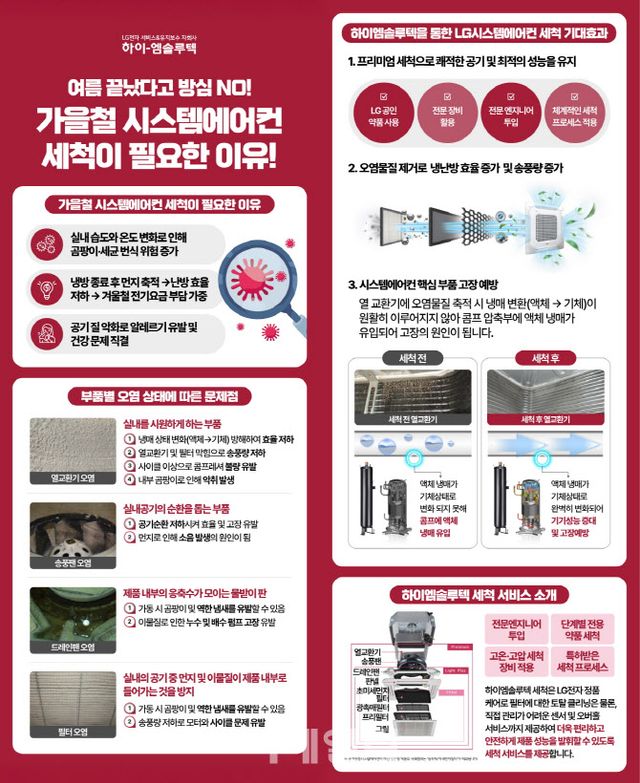 이번 인포그래픽은 △가을철 시스템에어컨 세척이 필요한 이유 △부품별 오염 상태에 따른 문제점 △세척의 기대효과 등을 직관적으로 담아냈다. 하이엠솔루텍은 시스템에어컨 세척을 통해 송풍량과 냉난방 효율을 개선하고, 기기 내부 열교환기에 쌓인 오염물질을 제거해 에너지 효율 상승과 다가오는 겨울철 사용할 기기의 고장을 사전에 예방할 수 있다는 점을 강조했다.