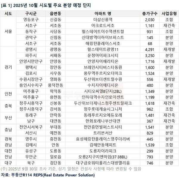 지방의 분양 예정 물량은 총 2만910가구로 ▲충북(3337가구) ▲광주(3216가구) ▲부산(2700가구 ▲충남(2370가구) ▲경북(2197가구) ▲경남(1926가구) ▲대전(1429가구) 등 순이다.