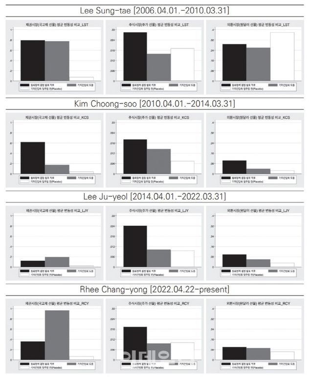 예를 들어 이주열 전 총재와 이창용 총재 재임 기간에는 기준금리 발표 직후보다 기자간담회 중의 채권시장 변동성이 더 크게 나타나는 경향이 확인됐다. 연구진은 “기준 금리 수준 자체보다는 중앙은행의 경기 판단 및 향후 정책 스탠스에 대한 시장의 관심이 상대적으로 높았던 상황과 관련 있을 것”이라고 해석했다. 이 전 총재는 코로나19 대유행 따른 완화적 통화정책 시행 시기에, 이창용 총재는 전 세계적인 인플레이션 대응을 위한 긴축 정책 시행 시기에 통화정책을 총괄했다.