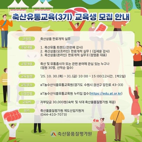 교육은 ▲축산유통 경향 ▲오프라인 판로의 종류 ▲자사 제품의 분석과 판로 선정 방법 ▲온라인 매출 확대를 위한 전략 ▲축산상품 유통 사례 등 실무 중심 내용으로 진행된다.