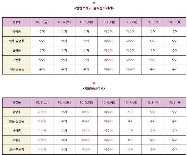 생활폐기물 수거는 일반 쓰레기의 경우 3일, 4일, 5일, 8일, 9일에, 재활용 쓰레기는 4일, 7일, 8일, 9일에 각각 수거된다.