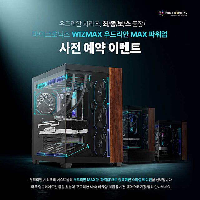 "마이크로닉스가 프리미엄 케이스 WIZMAX 우드리안 MAX와 냉각 액세서리 파워업 키트를 결합한 한정판 ‘WIZMAX 우드리안 MAX 파워업’ 사전예약을 시작했다. 천연 호두나무 패널, 듀얼 챔버 구조, ICEROCK 인피니티 aRGB 쿨링팬 7개와 전용 냉각 키트를 기본 제공해 강화된 쿨링 성능과 차별화된 디자인을 동시에 제공한다."