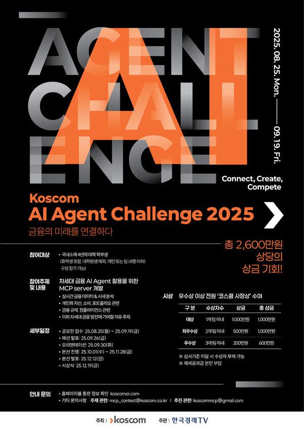 뉴시스 보도에 따르면, 회사 측에 따르면 이번 공모전은 'Connect, Create, Compete – 금융의 미래를 연결하다'를 슬로건으로, 차세대 금융 AI 에이전트 활용을 위한 MCP(Model Context Protocol) 서버 개발을 주제로 진행되고 있다.