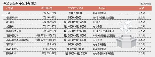 연휴 직후 가장 먼저 온디바이스 인공지능(AI) 전문기업 노타가 14~20일 수요예측을 진행한다. 이어 △비츠로넥스텍 △이노테크 △그린광학 △세나테크놀로지 △더핑크퐁컴퍼니 △나라스페이스테크놀로지 등이 10월 수요예측에 나선다. 11월에는 △아로마티카 △에임드바이오 △알지노믹스 등이 예정돼 있다.