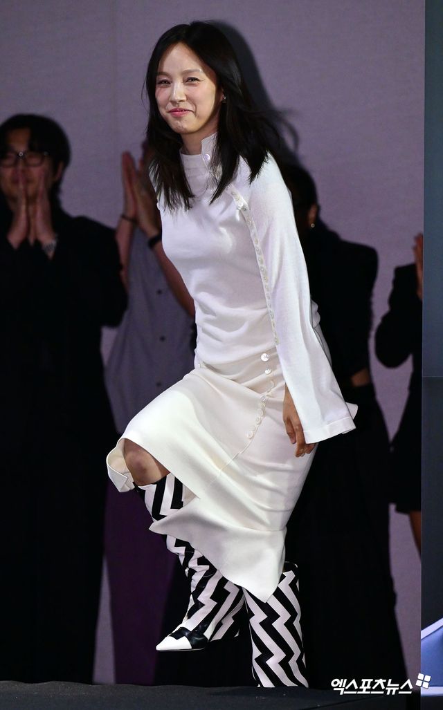 이날 이효리는 단정하면서도 유니크한 디테일이 돋보이는 화이트 원피스에 강렬한 블랙 앤 화이트 지그재그 패턴의 롱부츠를 매치해 단숨에 시선을 사로잡았다.