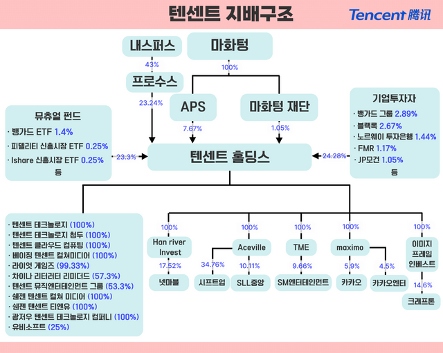 다만 마화텅 CEO의 노력에도 불구하고 여전히 텐센트의 지배구조 리스크는 완전히 해소되지 않았다는 분석이 우세하다. 텐센트의 최대주주는 프로수스(Prosus)이며 프로수스의 모회사인 내스퍼스(Naspers)는 남아프리카공화국에 본사를 둔 미디어 그룹이다. 내스퍼스의 최대주주는 남아프리카 국영 투자기관인 공공투자사(Public Investment Corporation·PIC)로 알려져 있다. 프로수스는 텐센트 지분 23.24%를 보유하고 있다. 이외에도 뮤추얼펀드가 23.1%, 기업투자자가 24.28% 등의 지분을 보유하고 있다.