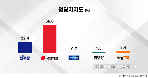 정당지지도는 국민의힘 56.8%, 더불어민주당 22.4%, 개혁신당 3.4%, 진보당 1.5%, 조국혁신당 0.7% 순으로 나타났다. 기타 정당 1.6%, 지지 정당 없음 12.4%, 잘 모르겠다 1.3%였다. 전 연령층에서 국민의힘이 오차범위 밖에서 우세하였다.