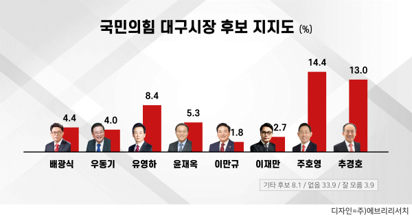 여론조사전문기관 ㈜에브리리서치가 '6.3 지방선거' 여론조사를 실시한 결과, 대구광역시장 국민의힘 후보 지지도 조사에서 주호영 국회부의장(14.4%)과 추경호 의원(13.0%)이 접전을 벌이는 것으로 나타났다. 뒤이어 유영하 의원 8.4%, 윤재옥 의원 5.3%, 배광식 북구청장 4.4%, 우동기 전 국가균형발전위원회 위원장 4.0%, 이재만 전 구청장 2.7%, 이만규 대구시의회의장 1.8% 순이었다. 기타 후보는 8.1%, 지지 후보 없음 33.9%, 잘 모름은 3.9%를 기록했다.