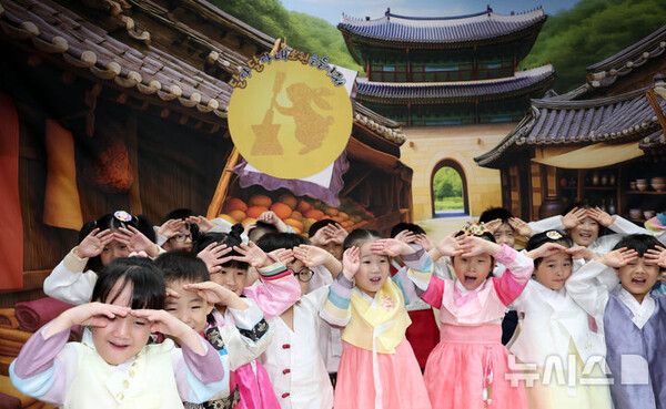 [서울=뉴시스] 추석 명절을 앞둔 1일 부산 부산진구청 어린이집에서 원생들이 한복을 곱게 차려 입은 채 큰절을 배우고 있다.
