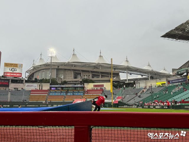 정상적인 개시 시각은 오후 6시 30분. 그러나 이날 경기를 앞두고 인천 지역에 굵은 비가 쏟아지면서 랜더스필드에 대형 방수포가 깔렸다. 레이더상 한 차례 비구름이 더 몰려온다는 예보가 있어 비가 지나가기를 기다려 보기로 했다. 잠시 소강상태가 되는 듯했으나 오후 6시 30분께 다시 비가 쏟아지기 시작했다.
