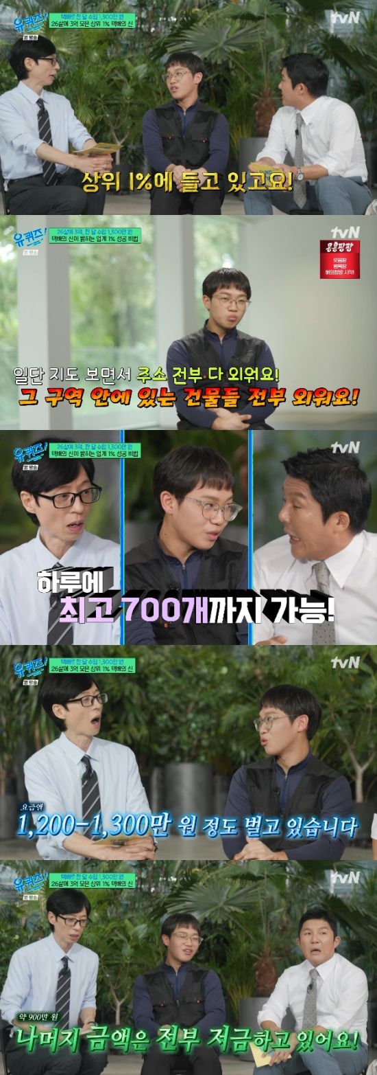 (엑스포츠뉴스 오수정 기자) '유퀴즈'에서 '택배의 신'이 월수입을 공개했다.