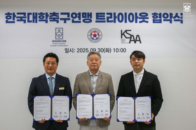 한국대학축구연맹(박한동 회장, 이하 KUFC)은 지난달 30일 한국축구지도자협회 사무실에서 한국축구지도자협회(회장 설동식, 이하 KFCA), 한국스포츠에이전트협회(회장 이동준, 이하 KSAA)와 대학축구 선수들의 진로 확대와 축구 발전을 위한 업무협약(MOU)을 체결했다.