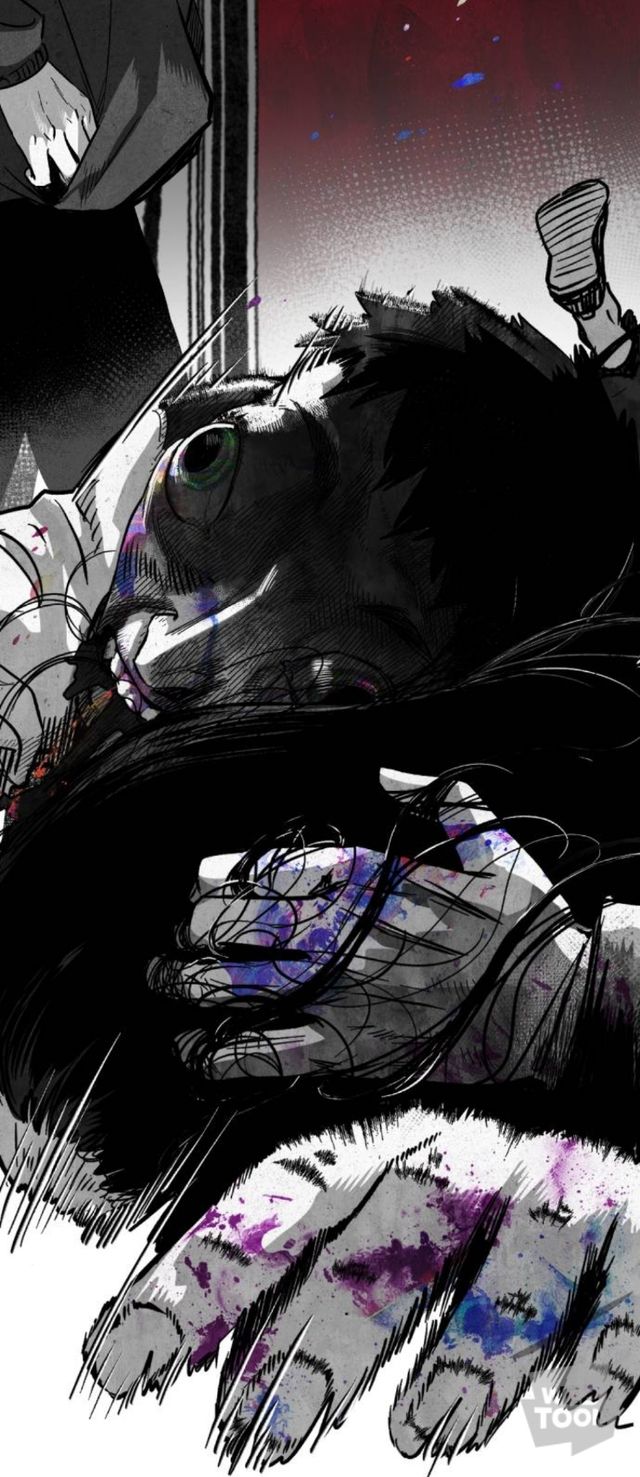 이어지는 컷에서는 "철퍽" 하는 소리와 함께 피가 보이고,