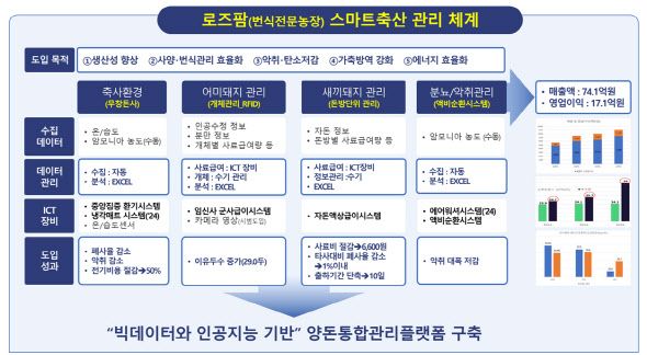 로즈팜의 성장 배경에는 정부의 지원도 한몫했다. 농식품부에 따르면 일정 규모 이상의 가축과 시설을 갖추고 있는 축사 약 3만 500호 가운데 2024년말 기준 스마트 축산 장비 및 솔루션을 도입해 활용하는 농가 비율은 약 28%(약 8600호) 수준이며, 2027년까지 40%(약 1만 3000호)까지 늘리겠다는 목표다.