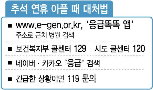 연휴 기간 몸이 아프면 먼저 문 여는 동네 병·의원이나 작은 응급실을 방문해 진료를 받아 보는 것이 좋다. 경증이면 방문한 의료기관에서 의사의 판단에 따라 치료를 받으면 되고, 병원 진찰 결과에 따라 중증질환이 의심된다면 큰 병원으로 신속한 이송이 가능하다.