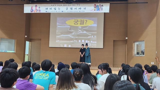 강연은 『쏭내관의 재미있는 궁궐이야기』의 저자인 송용진 작가가 맡았다. 송 작가는 궁궐의 건축과 공간, 그 속에 담긴 왕과 백성의 삶을 흥미진진하게 풀어내며, 단순히 과거의 사실을 암기하는 차원을 넘어 역사 속 다양한 인간의 선택과 사회 변화 과정을 탐구하는 것이 역사의 진정한 의미임을 강조했다. 이를 통해 학생들은 역사가 단순한 지식의 나열이 아닌, 사고력과 비판적 관점을 키우는 학문임을 깨닫게 되었다.