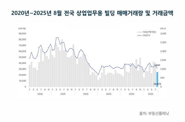 뉴시스 보도에 따르면, 2일 상업용 부동산 전문기업 부동산플래닛이 발표한 '2025년 8월 전국 상업업무용 빌딩 거래 시장 분석'에 따르면, 8월 전국 상업업무용 빌딩 거래량은 직전월보다 14.7% 줄어든 1037건으로 2025년 1월(832건)과 2월(1022건) 이후 최저치를 기록했다.
