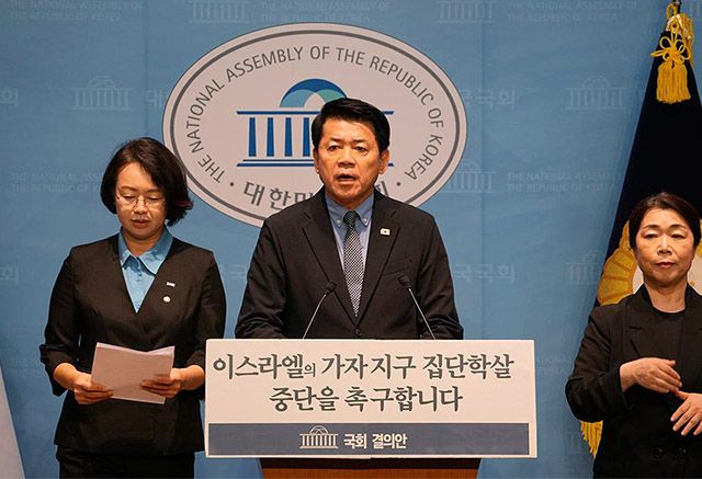 이스라엘이 팔레스타인 가자지구에 대한 지상군 투입에 이어 가자구로 들어가는 국제 구호선박을 막는 등 사실상의 점령을 위한 행동에 돌입하고 있는 가운데, 더불어민주당과 조국혁신당, 진보당 국회의원들이 이를 '집단학살'로 규정하고 중단을 촉구하는 결의안을 발의했다.