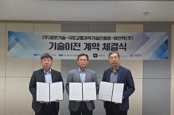 국토교통과학기술진흥원은 2일 연구원 중개를 통해 ㈜광운기술과 아인텍㈜ 간 기술이전 체결식을 열었다고 밝혔다.