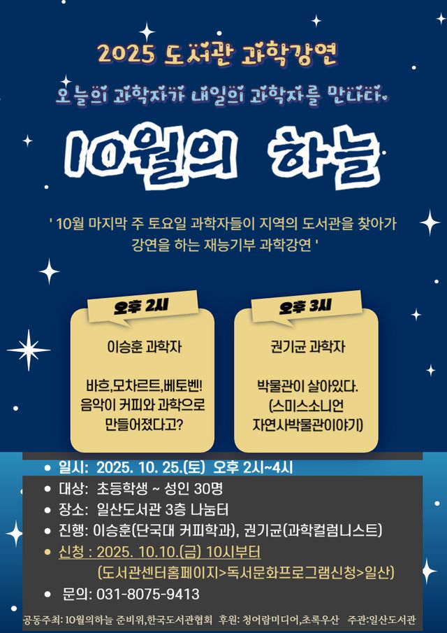 일산도서관은 과학자들의 재능기부 도서관 과학 강연프로그램 <10월의 하늘>을 운영한다.