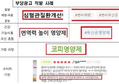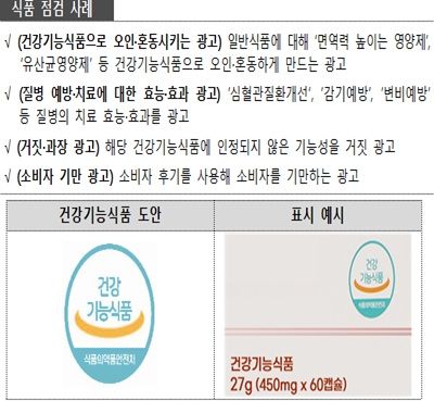 아울러, 건강기능식품 등을 온라인에서 구매하려는 경우 건강기능식품 도안과 ‘~에 도움을 줄 수 있음’과 같은 기능성 내용을 꼼꼼히 확인하고, 검증되지 않은 의학적 효능·효과 등을 내세우는 부당광고에 현혹되지 않도록 주의해야 한다.