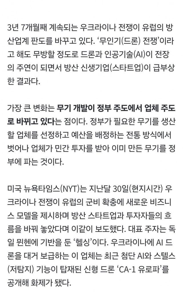 독일 신흥 방산기술기업 헬싱이 AI와 스텔스를 드론한 대형 드론을 이번에 공개한것이다.