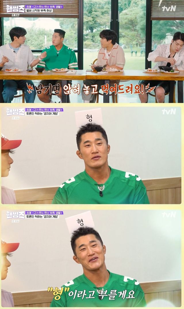 이후 진행된 ‘금지어 게임’에서는 예상치 못한 폭탄 발언이 쏟아졌다. 금지어가 ‘형’이었던 김동현은 “저랑 친한 형인 추성훈 형이 오면 재미있지 않냐”고 말했다가 제지를 받았다. 이어 “40대도 많이 본다니까 임영웅 씨도 오면 좋겠다”며 돌발 발언을 해 멤버들을 폭소케 했다. 차태현이 “임영웅이 오면 형이라고 할 수 있냐”고 묻자, 김동현은 “영웅이 형, 얼마든지 잘하겠다. 회의도 없애겠다”며 영상 편지까지 남겼다.