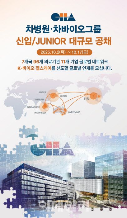 이번 채용은 △의료부문(분당차병원·구미차병원·의료재단) △연구원(차의학연구원) △기업부문(차바이오텍·CMG제약·서울CRO) 등 7개 기관에서 한다. 모집 분야는 난임연구, 연구개발, 사무행정, 전산(IT), 건설 등이며 모집 인원은 두 자릿 수다.