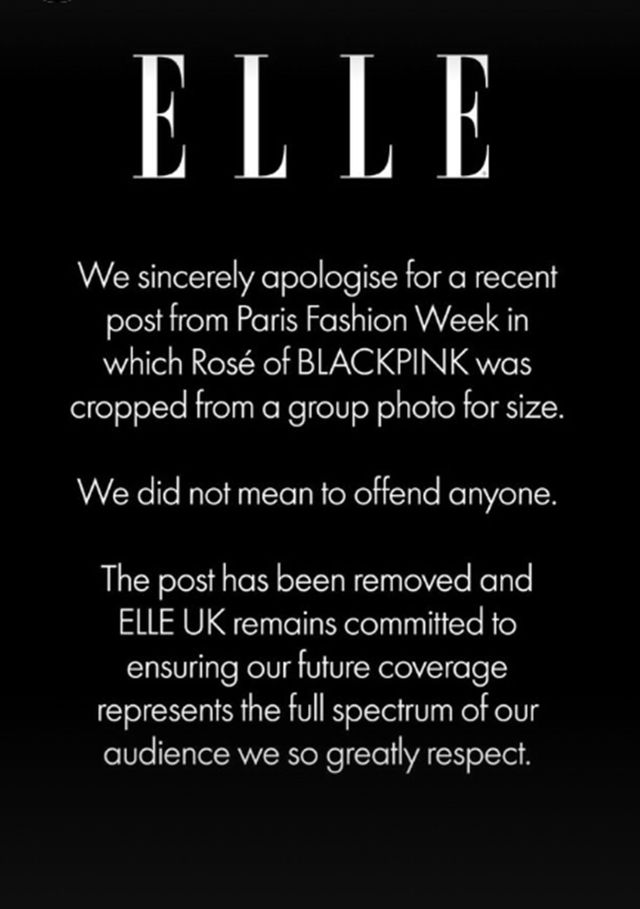 엘르 UK는 2일(현지시간) 공식 SNS를 통해 “파리 패션위크 관련 게시물에서 블랙핑크 로제가 사진 크기 조정을 이유로 단체 사진에서 제외됐다”며 “불쾌감을 주려는 의도는 없었다”라고 밝혔다.