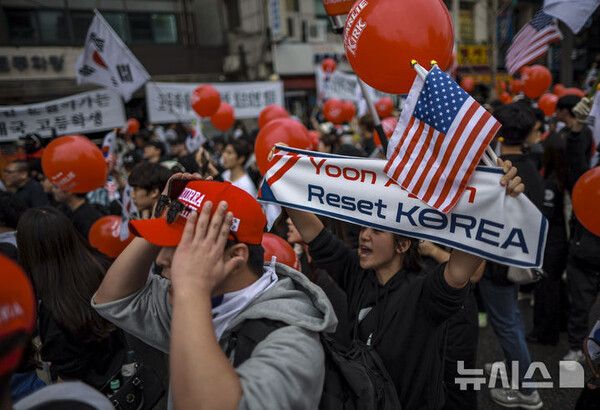 이들은 대형 태극기와 성조기를 흔들며 "이재명 구속" "윤석열 대통령" 구호를 외쳤다.