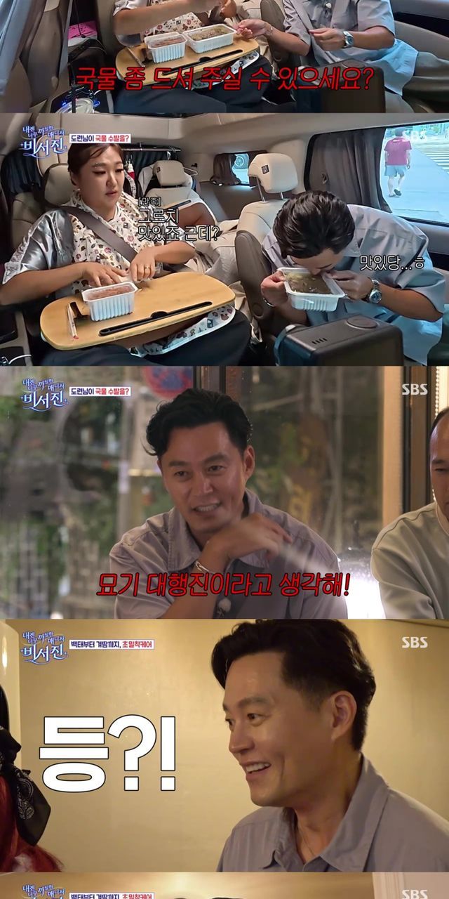 이날 가장 큰 화제를 모은 장면은 차 안 순댓국 먹방이었다. 점심 메뉴로 순댓국을 고른 이수지는 이동하는 차량 안에서 포장용기를 깔고 식사를 강행했다. 이를 본 이서진은 “차에서 순댓국 먹는 건 묘기 대행진이라고 생각한다. 차에서 순댓국을 먹는다는 건 상상도 할 수 없는 일이다”라며 혀를 내둘렀다. 특히 넘칠 듯한 국물에 이수지가 “국물 좀 드셔주실 수 있느냐”고 부탁하자 이서진은 직접 국물을 마셔주는 ‘국물 수발’까지 선보이며 웃음을 더했다. 그는 인터뷰에서 “입으로 고기는 안 들어오고 파만 들어오더라”고 농담을 던져 웃음을 자아냈다.