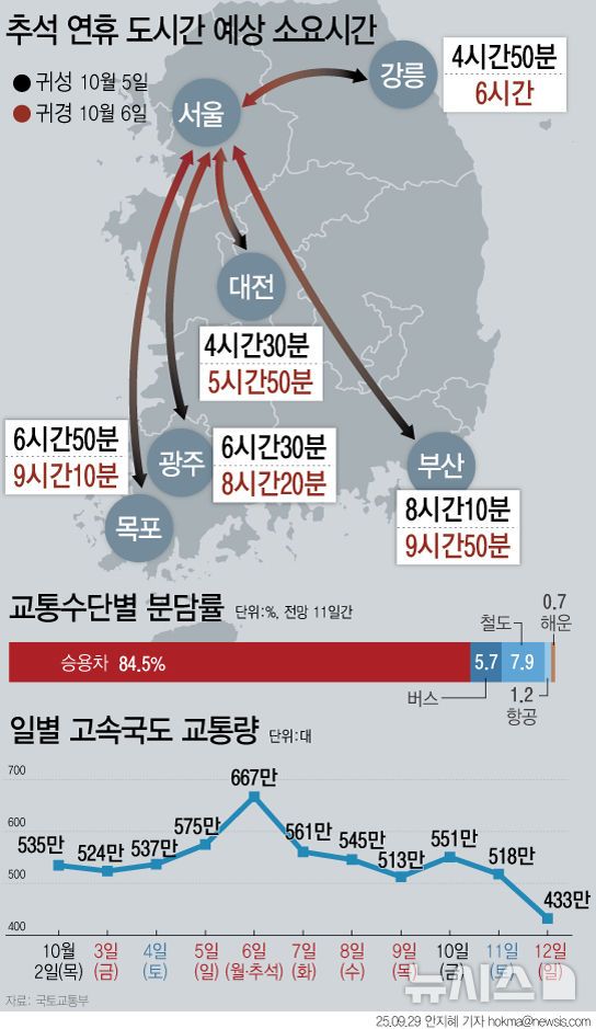 오전 11시 요금소 기준으로 승용차를 이용한 주요 도시 간 예상 소요시간은 하행선 ▲서울~부산 6시간30분 ▲서울~대구 5시간40분 ▲서울~광주 5시간20분 ▲서울~대전 2시간50분 ▲서울~강릉 4시간10분 ▲서울~울산 6시간 ▲서울~목포 5시간40분이다.