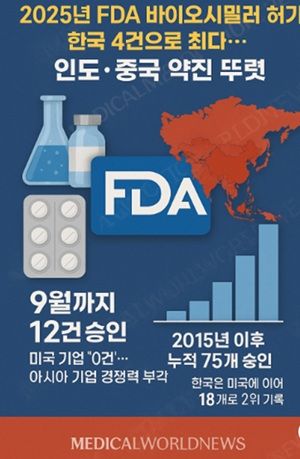 10월 1일 미국 FDA가 공개한 바이오시밀러 허가 현황에 따르면, 2025년 9월 말까지 허가된 12개 제품 중 한국이 4건으로 가장 많았다.