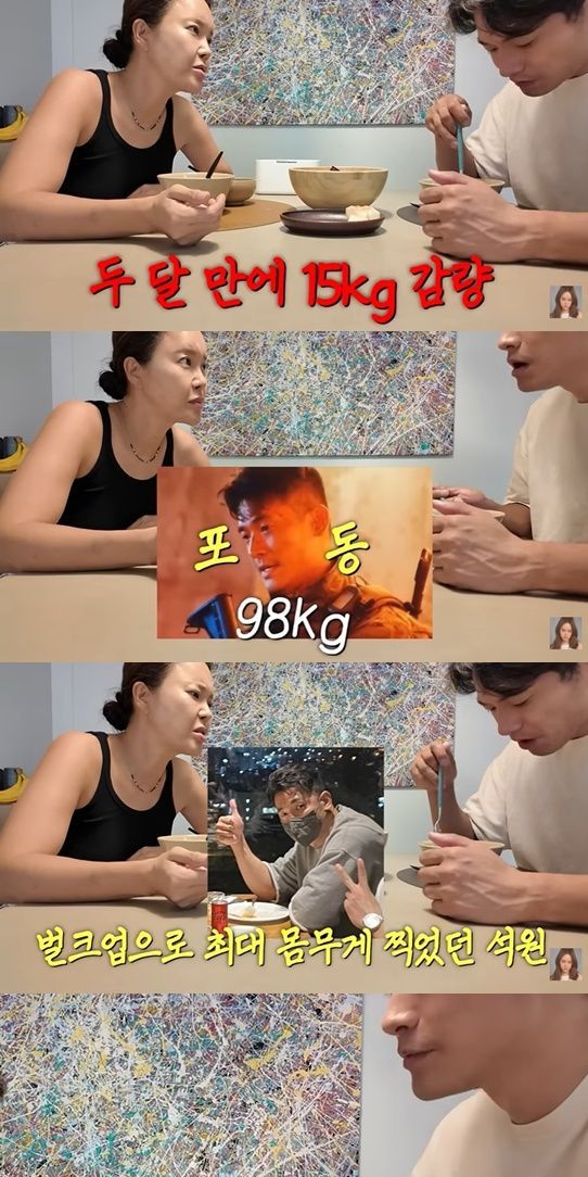 정석원은 "근데 갑자기 감독님이 살을 빼달라고 했다. 촬영 때는 15kg가 아니라 20kg 넘게 빠졌다. 72kg까지 뺐다"며 두 달 만에 98kg에서 72kg까지 26kg을 감량했음을 밝혔다.